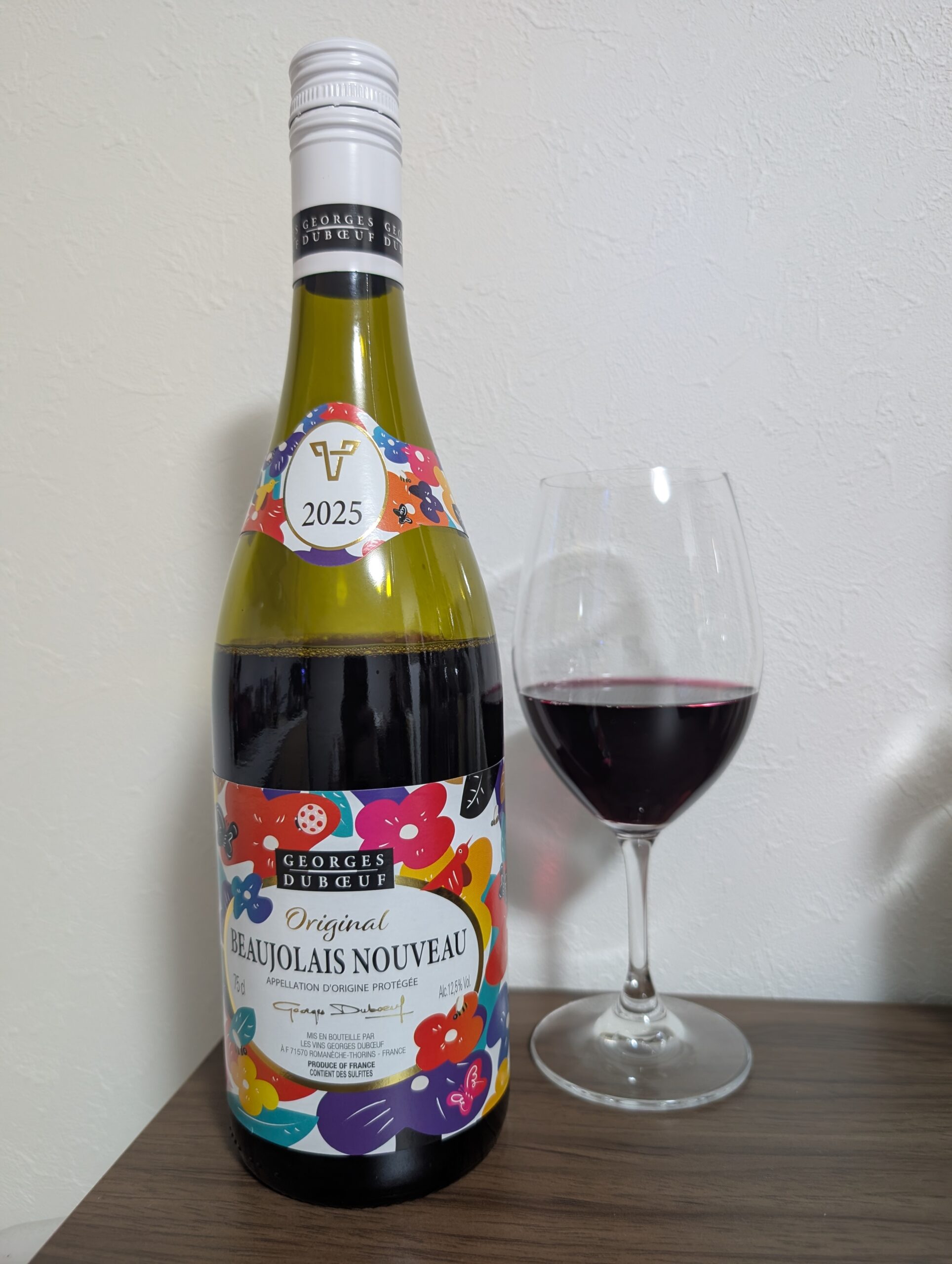 今回選んだのは「ジョルジュ・デュブッフ ボジョレー・ヌーヴォー 2025」。近所のスーパーで気軽に手に入るのが何よりありがたい一本です。去年はヴィラージュを飲んだのですが、今年は原点回帰でスタンダードなヌーヴォーをチョイスしてみました。